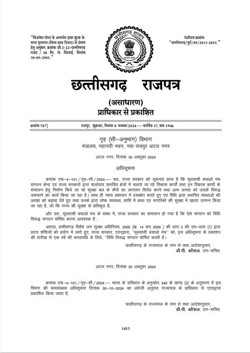 और यत:, मूलवासी बचाओ मंच के संबंध में, राज्य सरकार का समाधान हो गया है कि ऐसे संगठन को विधि विरूद्ध संगठन घोषित करना आवश्यक है। अधिसूचना में कहा गया है कि छत्तीसगढ़ विशेष जन सुरक्षा अधिनियम, 2005 (क्रं. 14 सन् 2006) की धारा 3 की उप-धारा (1) द्वारा प्रदत्त शक्तियों को प्रयोग में लाते हुए, राज्य सरकार, एतद्वारा, ‘मूलवासी बचाओ मंच’ को, इस अधिसूचना के प्रकाशन की तारीख से एक वर्ष की कालावधि के लिये, ‘विधि विरूद्ध संगठन’ घोषित करती है।