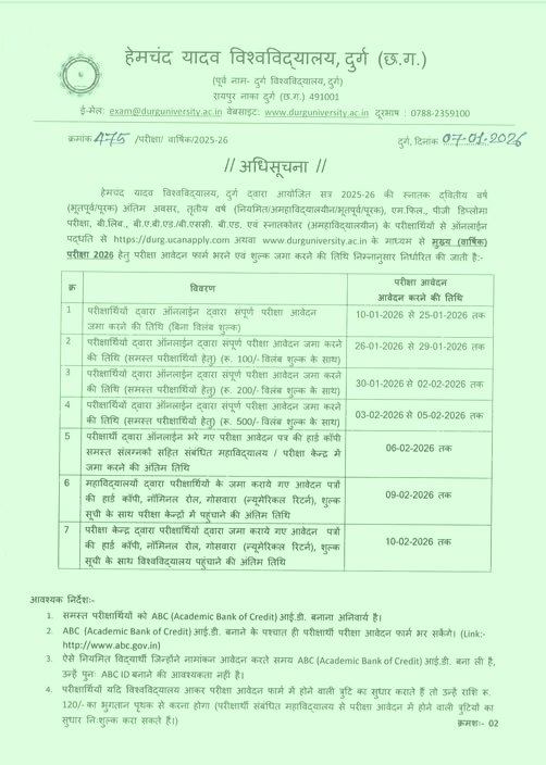 दक्षिण कोसल टीमहेमचंद यादव विश्वविद्यालय (विवि) दुर्ग द्वारा आयोजित सत्र 2025 - 26 की दर्शनशास्त्र स्नातकोत्तर प्राइवेट (अमहाविद्यालयीन) के परीक्षार्थियों से दिग्विजय कॉलेज केन्द्र के लिए ऑनलाईन पद्धति से विश्वविद्यालय के वेबसाईट के माध्यम से मुख्य (वार्षिक) परीक्षा 2026 हेतु परीक्षा आवेदन फार्म भरने एवं शुल्क जमा करने की तिथि निर्धारित की गई हैं।
